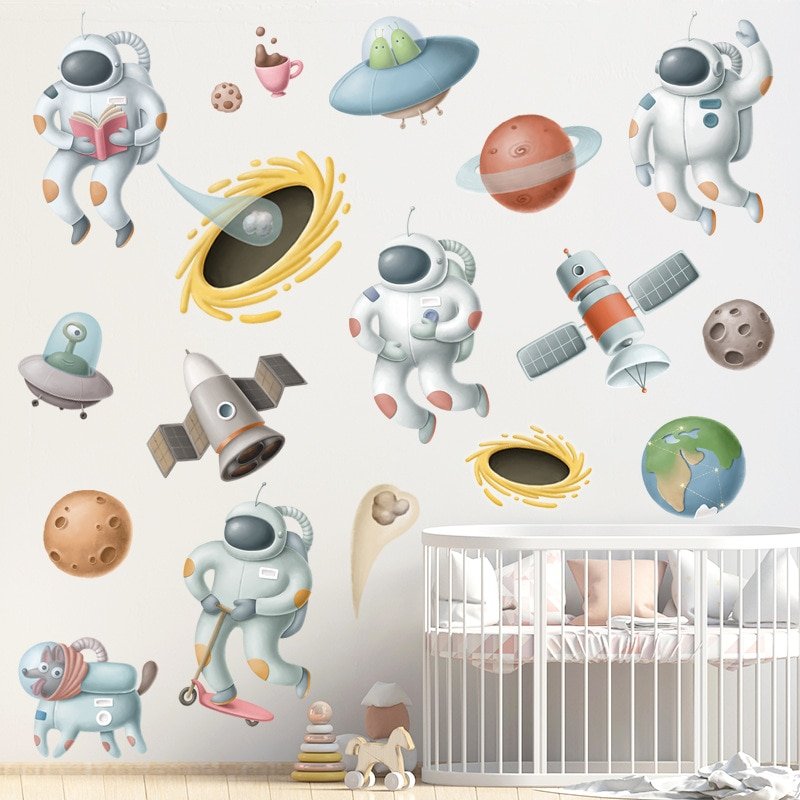 Stickers muraux avec motifs espace, trou noir, planètes, et pilote.