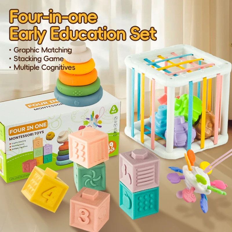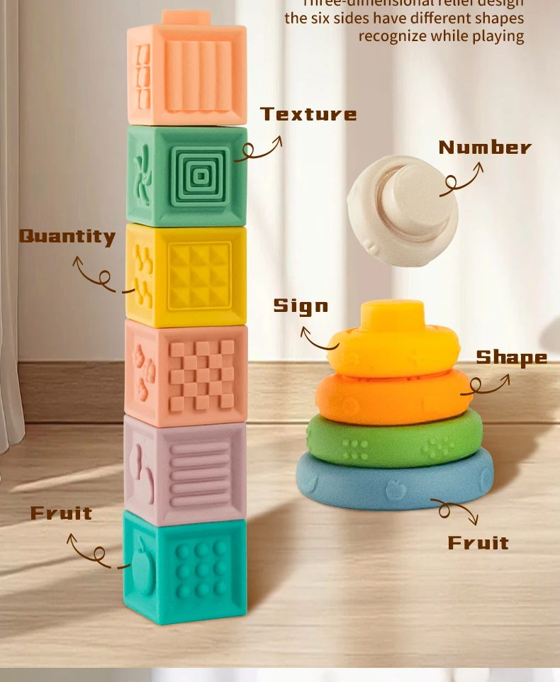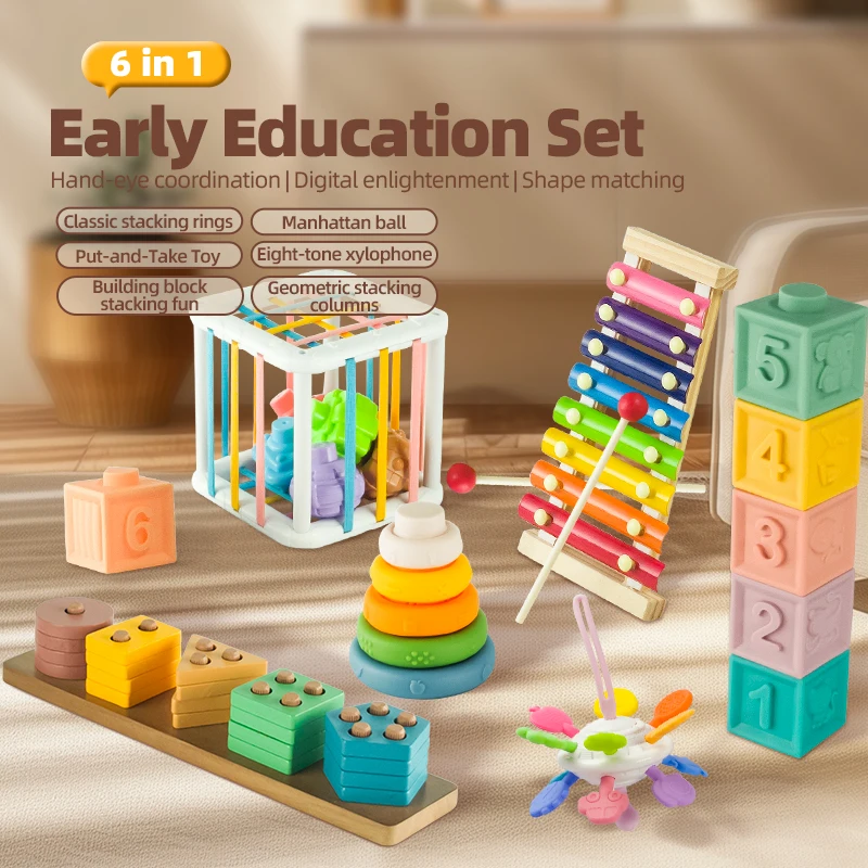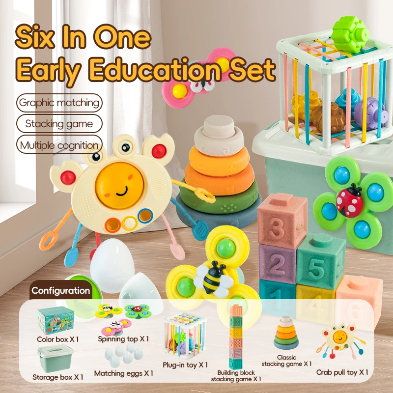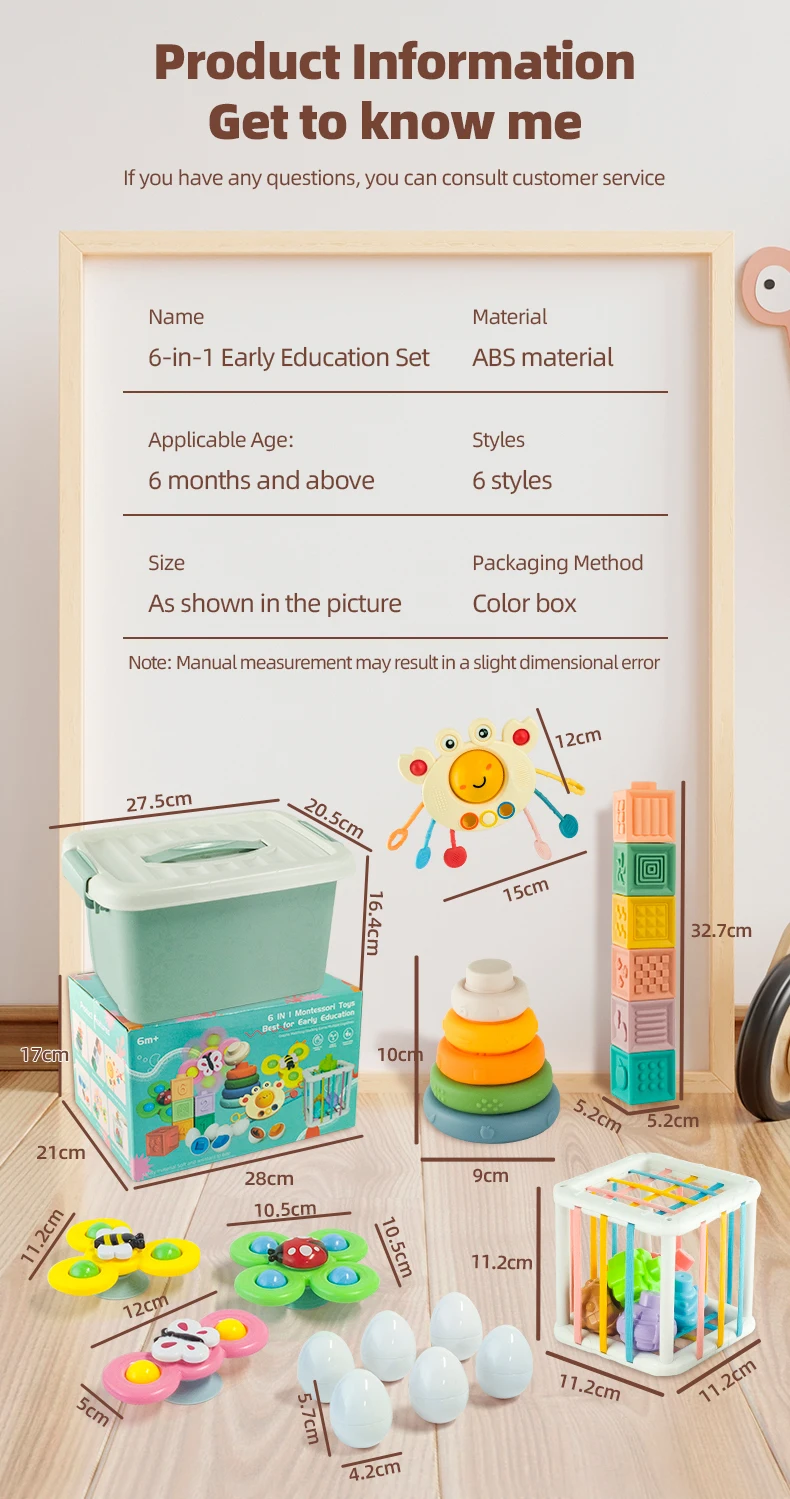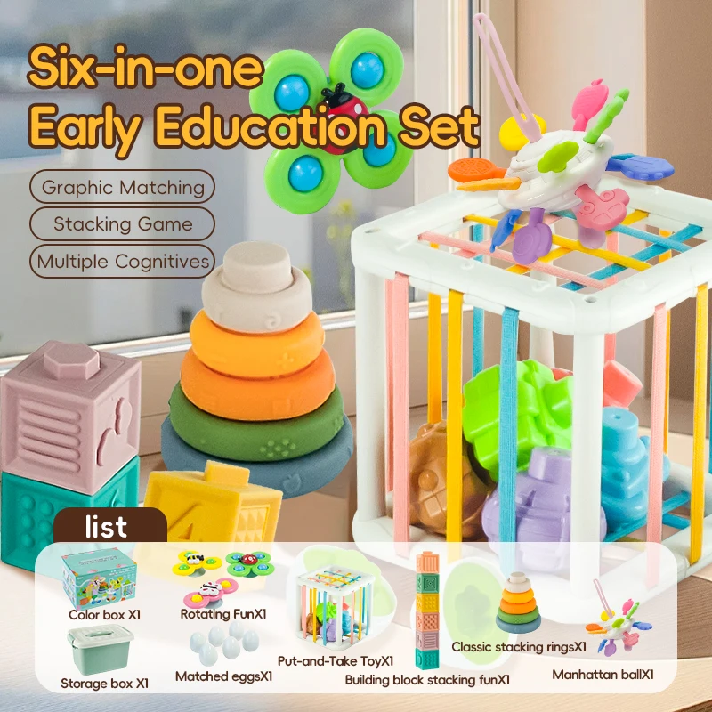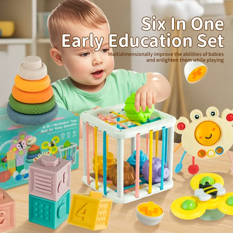 Baby Early Education Montessori Toy 6 in 1 Multifunctional Infant Soft Rubber Sensory Training Toys Stacking Toy Set With Box