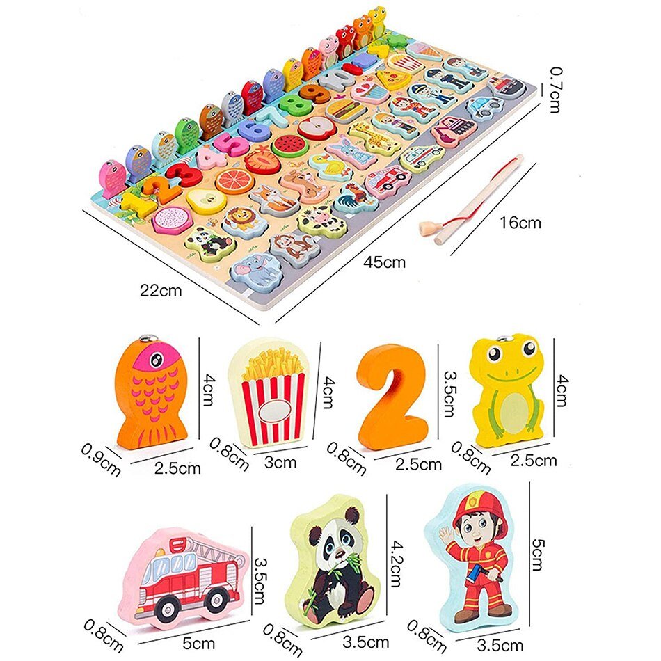 L’ensemble comprend divers jouets éducatifs tels que des jeux de mathématiques, de pêche et d’autres activités adaptées à l’apprentissage précoce.