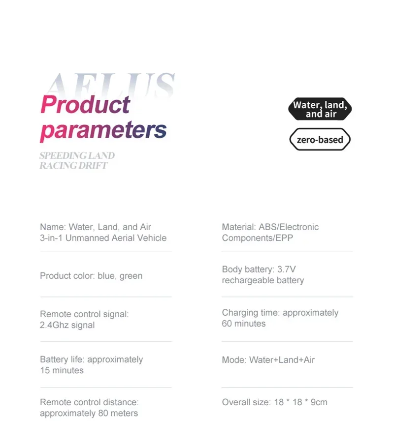 All-in-one gameplay, easy to operate, the aircraft and the foam hull can be freely combined to realize various gameplays of sea, land and air. The switching of gameplay modes is simple and easy to use, and it is not limited to the environment (indoor, outdoor, swimming pool and other water surfaces)