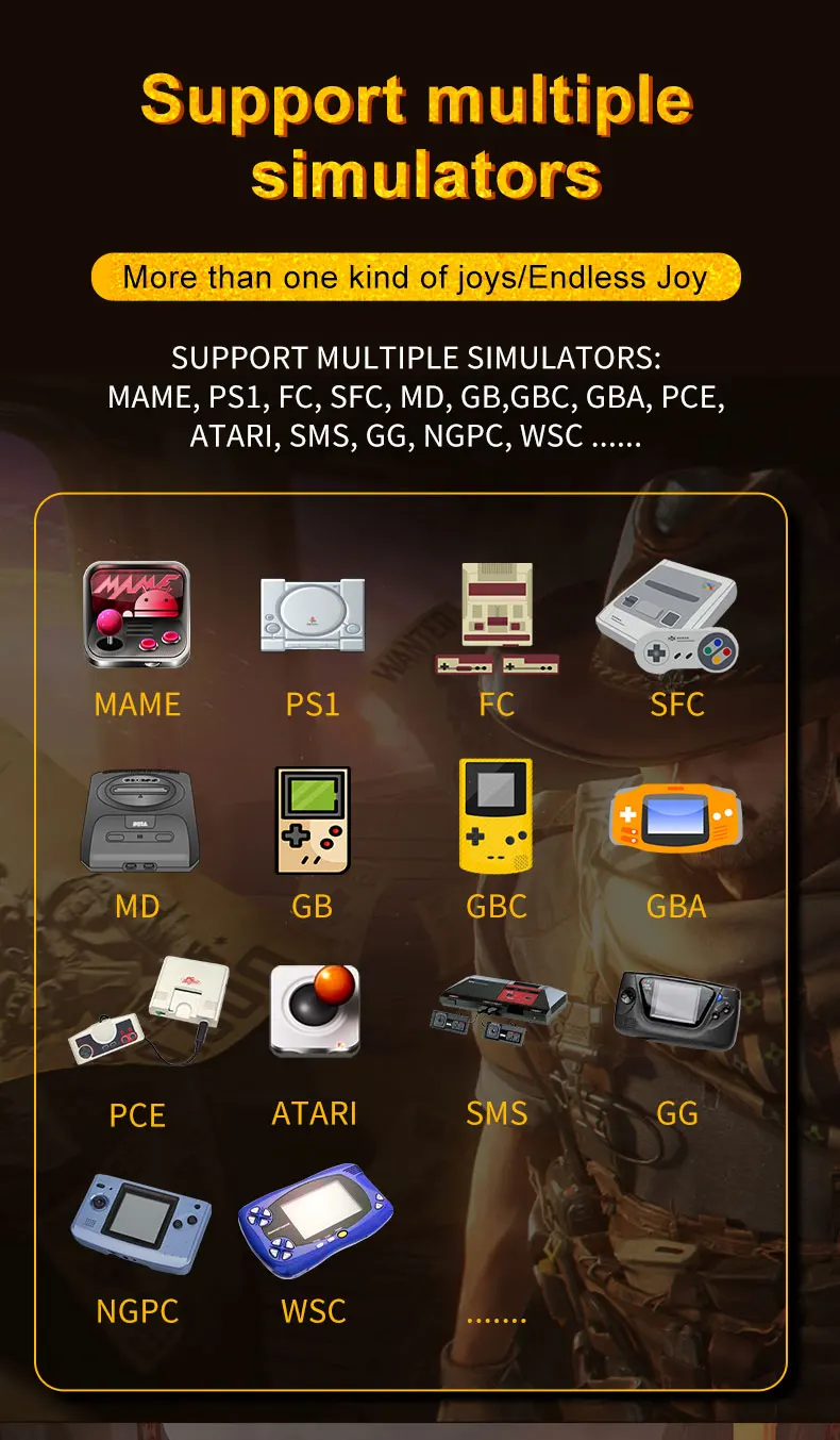 support arcade,mame,atari2600,atari5200,atari7800,atarilynx,cps1,cps2,cps3,fbneo,gamegear,gb,gba,gbc,genesis,megadrive,nes,nesh,ngpc,pcengine,psx,sfc,snes..