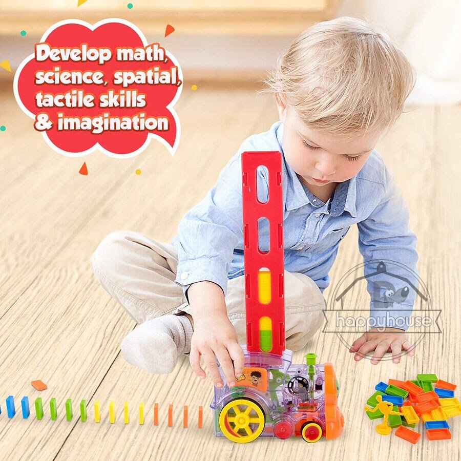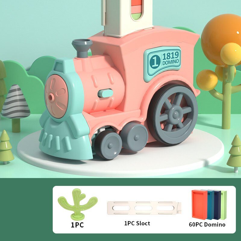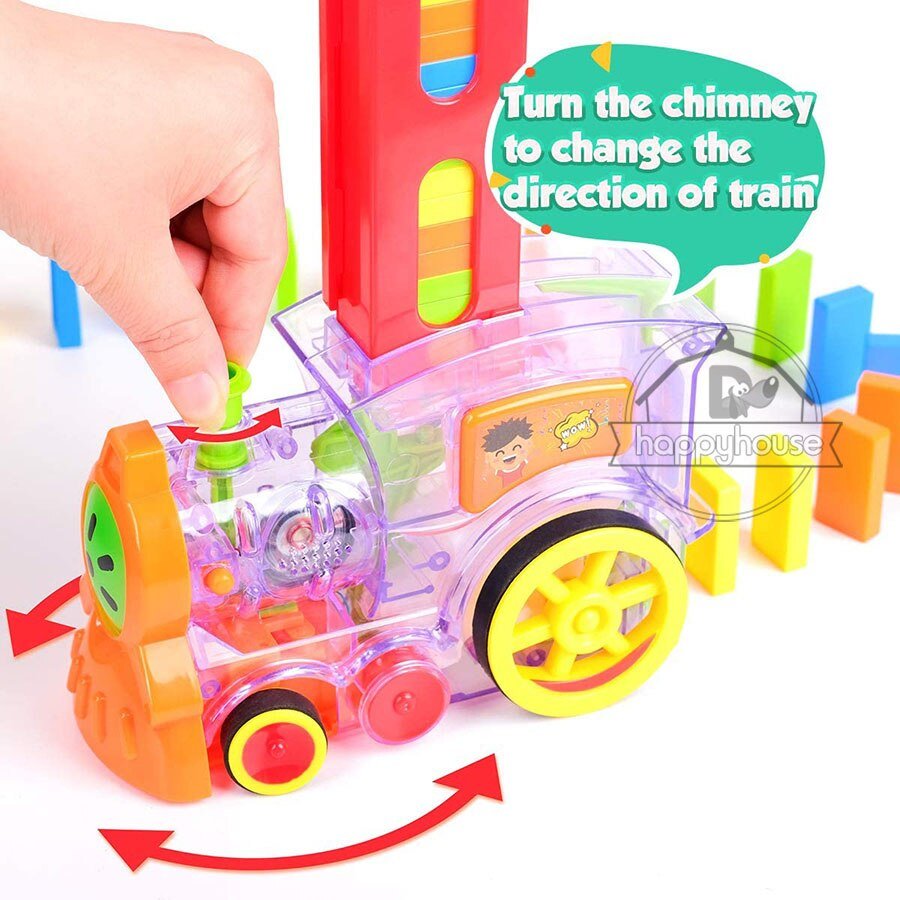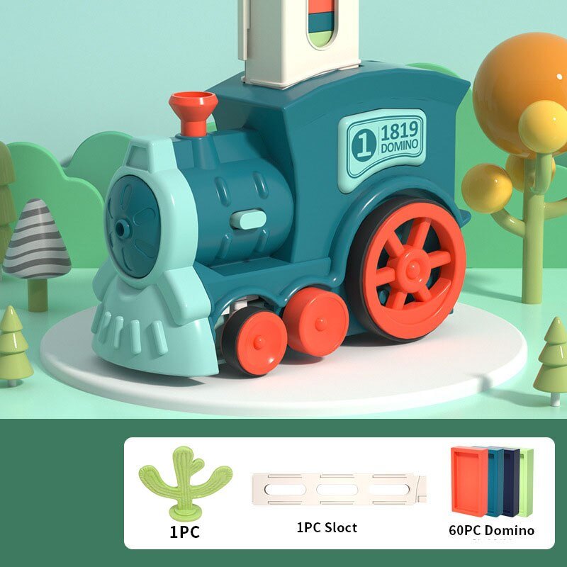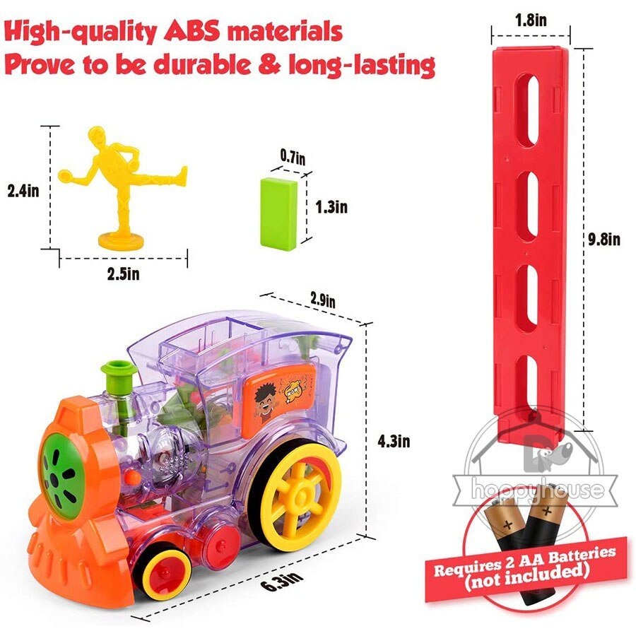 Le train fonctionne avec 2 piles AA et émet des sons réalistes lorsqu’il est en marche. Il est facile à utiliser : il suffit de placer les dominos dans la trémie et de démarrer le train.