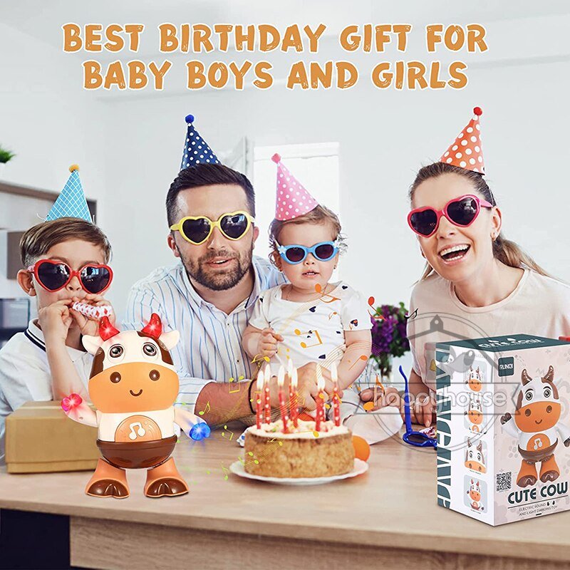 Vache jouet qui danse avec musique et lumières pour bébés.