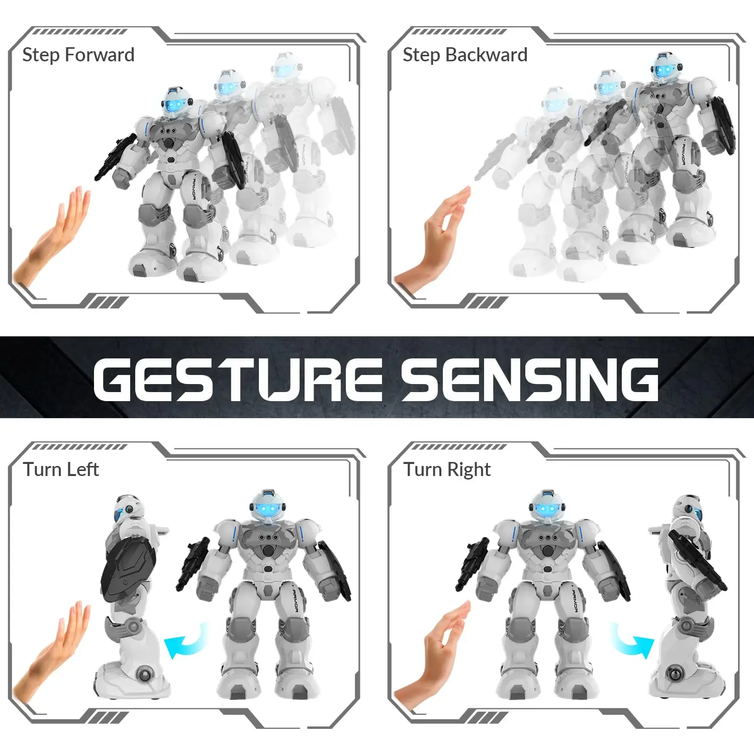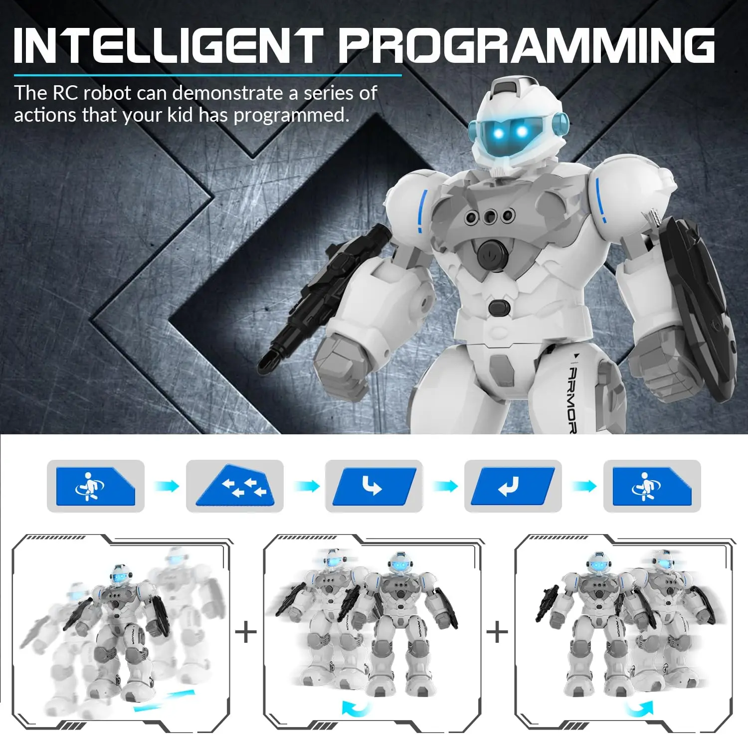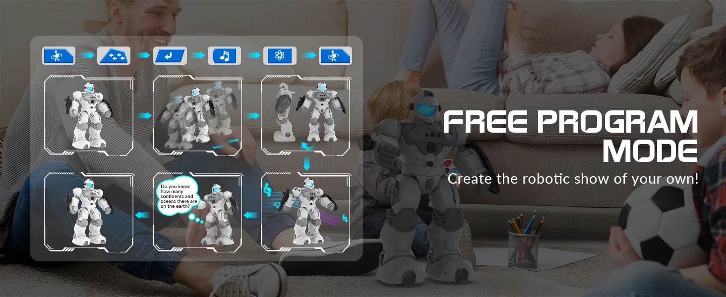 3. Intelligent Programming (Children can freely program the remote control keys to control the robot to display corresponding actions)