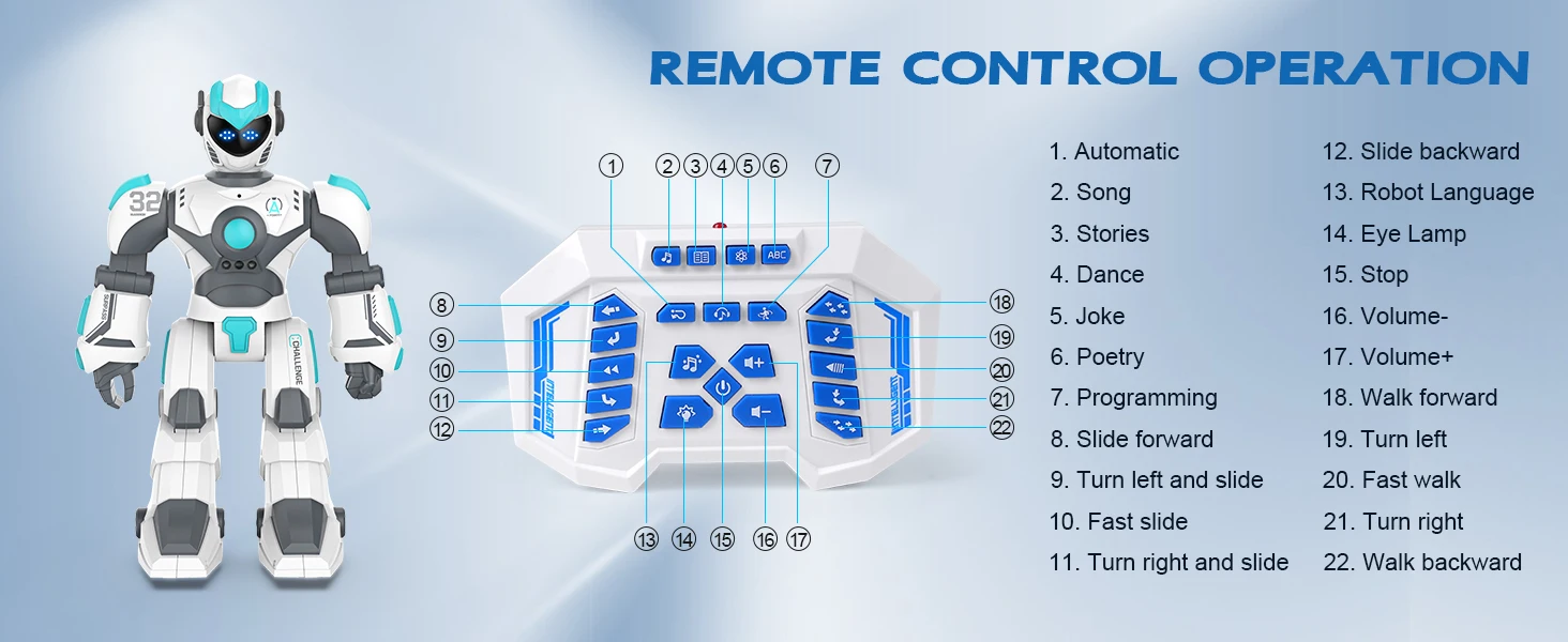 3. Intelligent Programming (Children can freely program the remote control keys to control the robot to display corresponding actions)